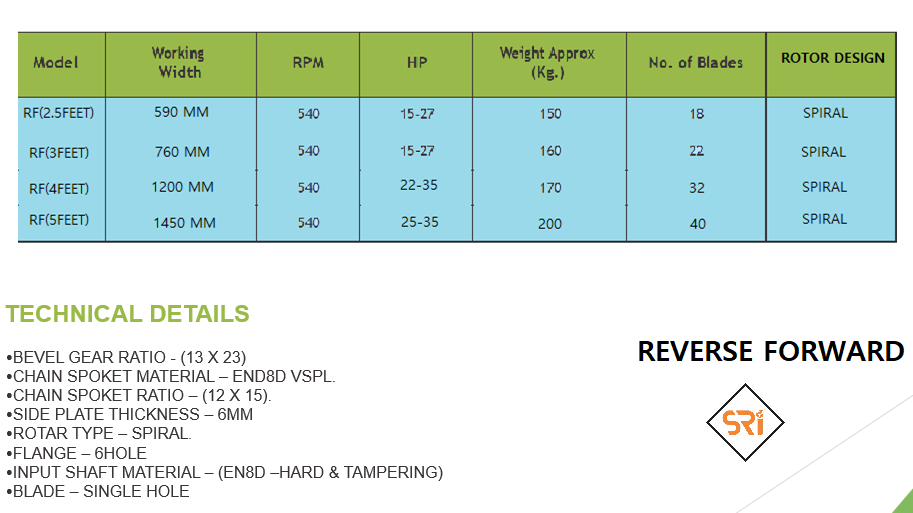 The RF rotary tiller is a twin way operating compact machine. Its gearbox is designed for its rotor to work in dual direction i.e. forward & reverse. The reverse tillage function helps perform deep tillage along with fine pulverization in the first pass itself. Reverse/Forward Rotavator series is specially designed for compact and small tractors 15 to 30 HP tractors it is particularly used for seed bed preparation, gardening and all king of horticulture. This multi-functional Rotavator is side chain drive is giving best output of both side of application. Universal attachments system of the rotary tiller makes it more suitable of all kind of mini tractors. It Is Mainly Used Is Sugarcane, Banana, Pomegranate, Grapes, Grange, Papaya, Cotton Etc…
